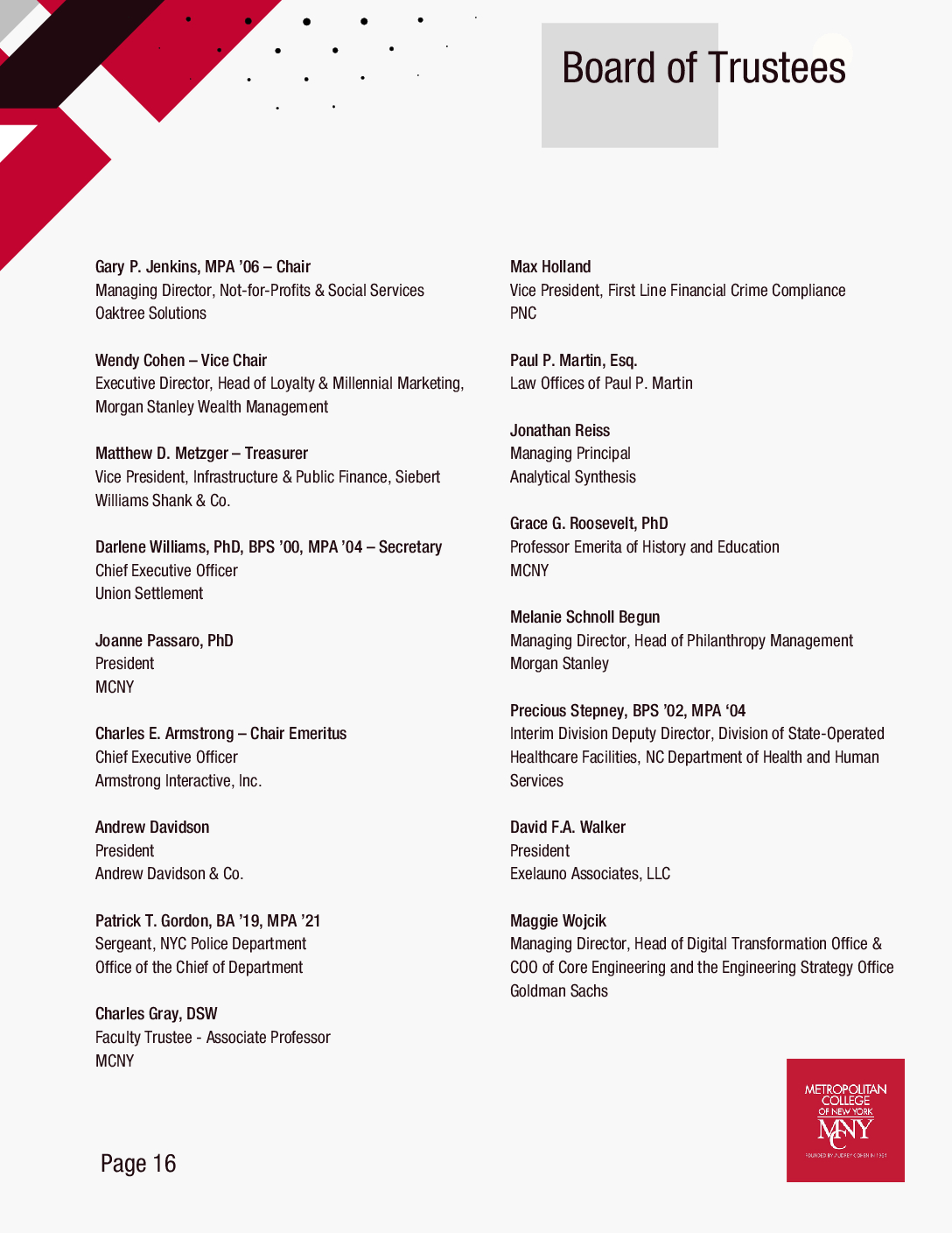 It’s good to come home! As I write this message just one year into being Board Chair, I am reminded that there is nothing like feeling welcomed, being supported and sharing a common goal of improving the workplaces and communities in which we work and live. This goal was the reason I enrolled in MCNY’s School of Public Administration in 2005. Years later as a graduate, an adjunct professor, a trustee and now as Board Chair, my commitment to MCNY’s mission of educating and empowering students to make constructive change is stronger than ever.